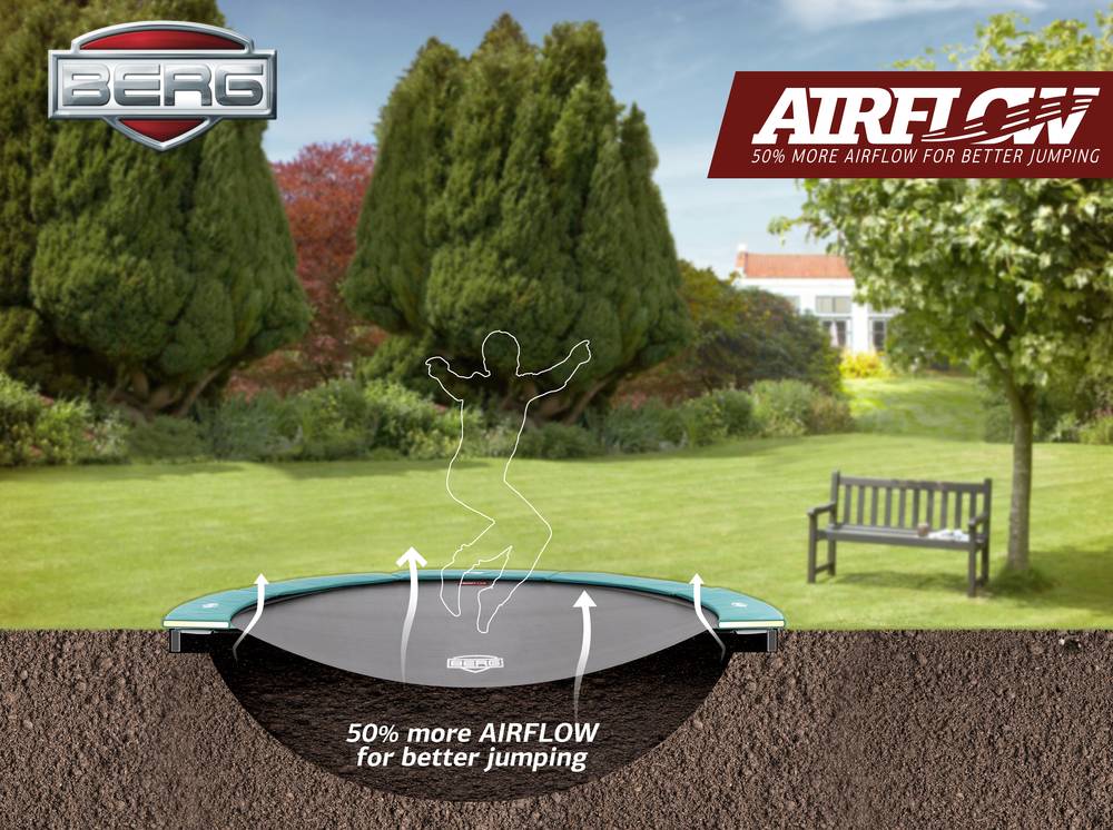 Das BERG FlatGround ELITE ist mit dem einzigartigen Airflow-Sprungtuch von BERG ausgestattet, das 50 % mehr Luft durchlässt und so besonders müheloses Springen ermöglicht.